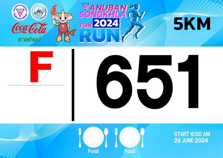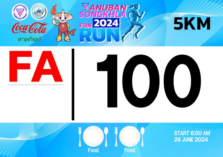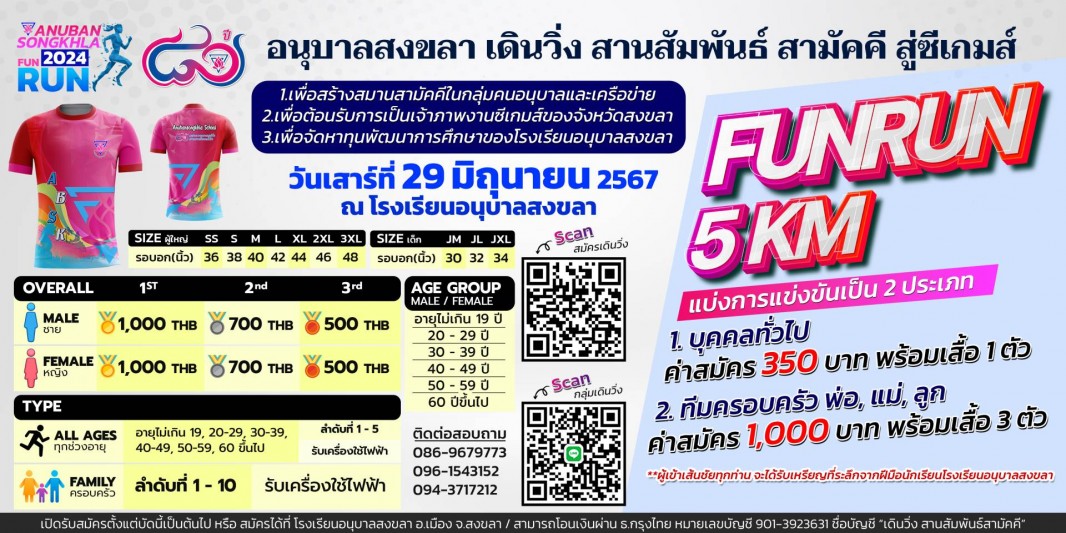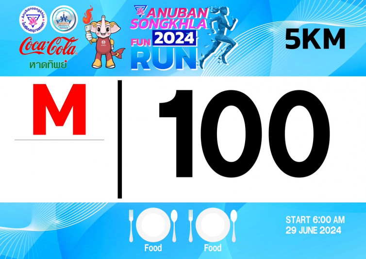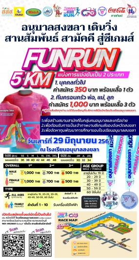 "อนุบาลสงขลาเดินวิ่ง สานสัมพันธ์ สามัคคี สู่ซีเกมส์" ณ โรงเรียนอนุบาลสงขลา วันเสาร์ ที่ ๒๙ มิถุนายน ๒๕๖๗ สมัครได้แล้วถึงวันที่ ๒๓ มิถุนายน ๒๕๖๗ (ปิดระบบสมัครออนไลน์แล้ว ผู้สนใจสามารถติดต่อสมัคร Onsite ณ โรงเรียนอนุบาลสงขลา) ที่ http://80yrsfunrun.anubansongkhla.ac.th พร้อมของรางวัลมากมาย รอทุกท่านอยู่ !!! *** เริ่มปล่อยตัวนักวิ่งเวลา ๐๖.๐๐ น. ***